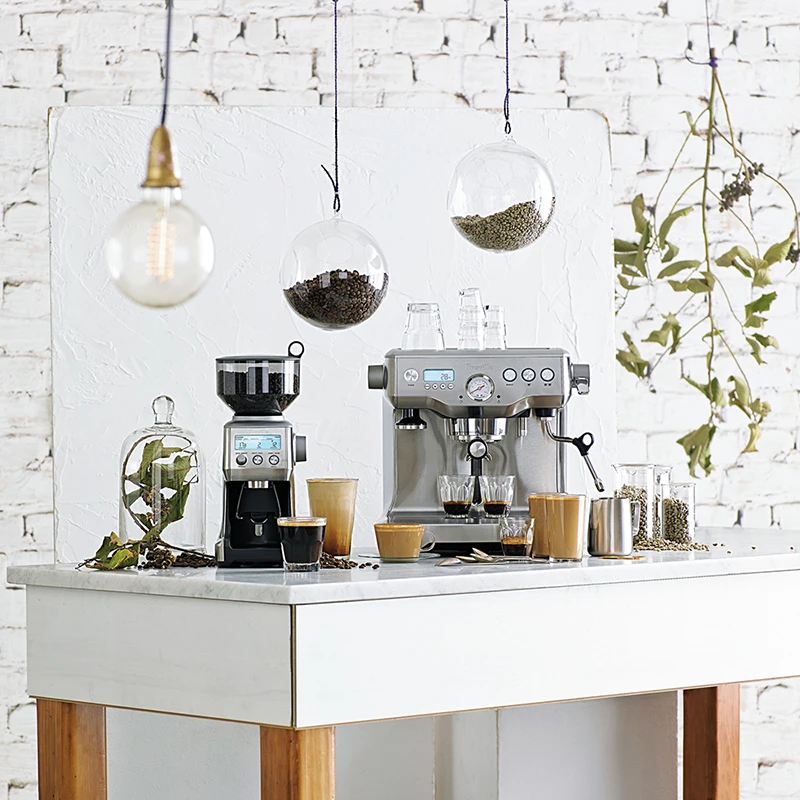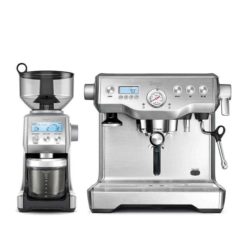Das dynamische Duo von Sage liefert alles, was es zur professionellen Zubereitung exklusiver Espressobohnen benötigt wird. Dieses Duo besteht aus der Sage The Dual Boiler Siebträgermaschine und der Smart Grinder Pro Kaffeemühle. Beide Geräte ergänzen sich technisch optimal und machen auch optisch eine gute Figur in der heimischen Kaffeeküche.
