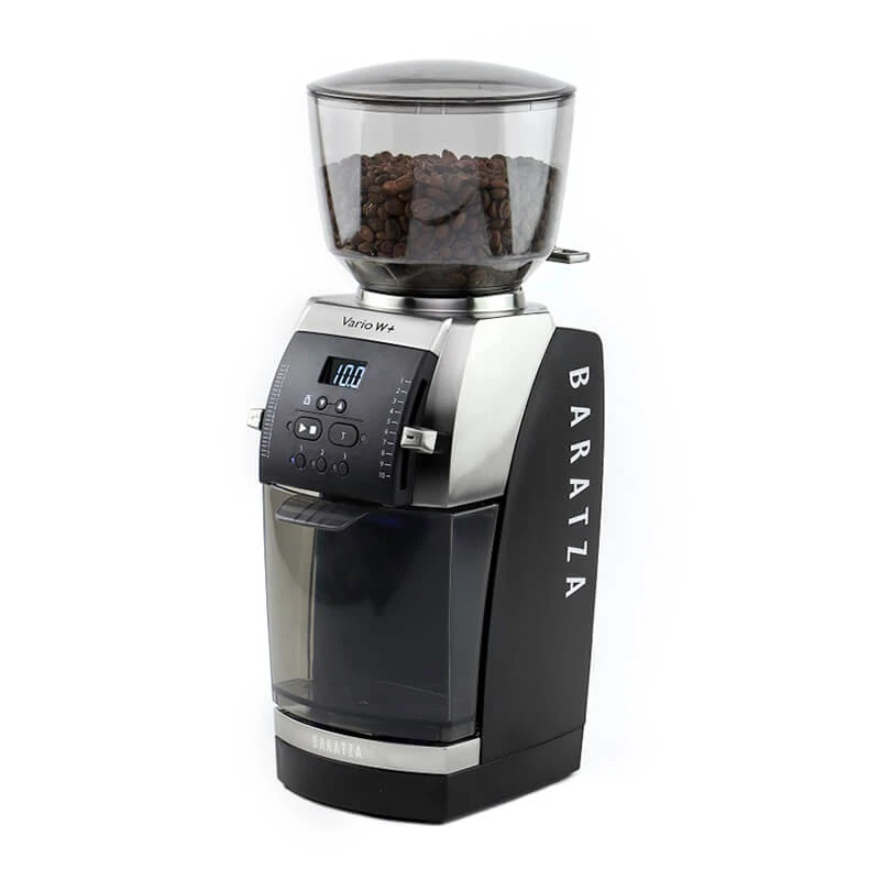 Die Vario W+ von Baratza ist für all diejenigen gedacht, die bei der Zubereitung ihres Kaffees Wert auf höchste Präzision legen. Mit ihrer eingebauten Waage und der Genauigkeit auf 0,1 g wird die Portionsgröße direkt in Gramm gesteuert. Bei anderen Kaffeemühlen, so auch der Vario+ ohne den Zusatz W, geschieht dies lediglich über einen Timer. Auf diese Weise ist die Baratza Vario W+ hervorragend geeignet für alle, die genau wissen, wie viel Kaffeemehl sie für ihre Zubereitung benötigen. Im Vergleich zu der normalen Vario W bietet das Plus-Modell ein verbessertes Bedienfeld und Display, sowie auf Filterkaffee spezialisierte Mahlscheiben des Schweizer Herstellers Ditting aus Stahl, statt Keramik. Zudem ist die Mahlwerkskammer nun aus Metall gefertigt und der Auswurfbereich wird von LEDs beleuchtet.